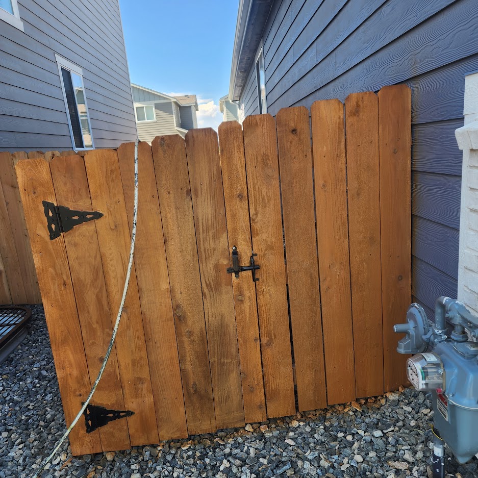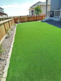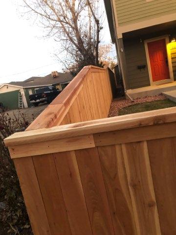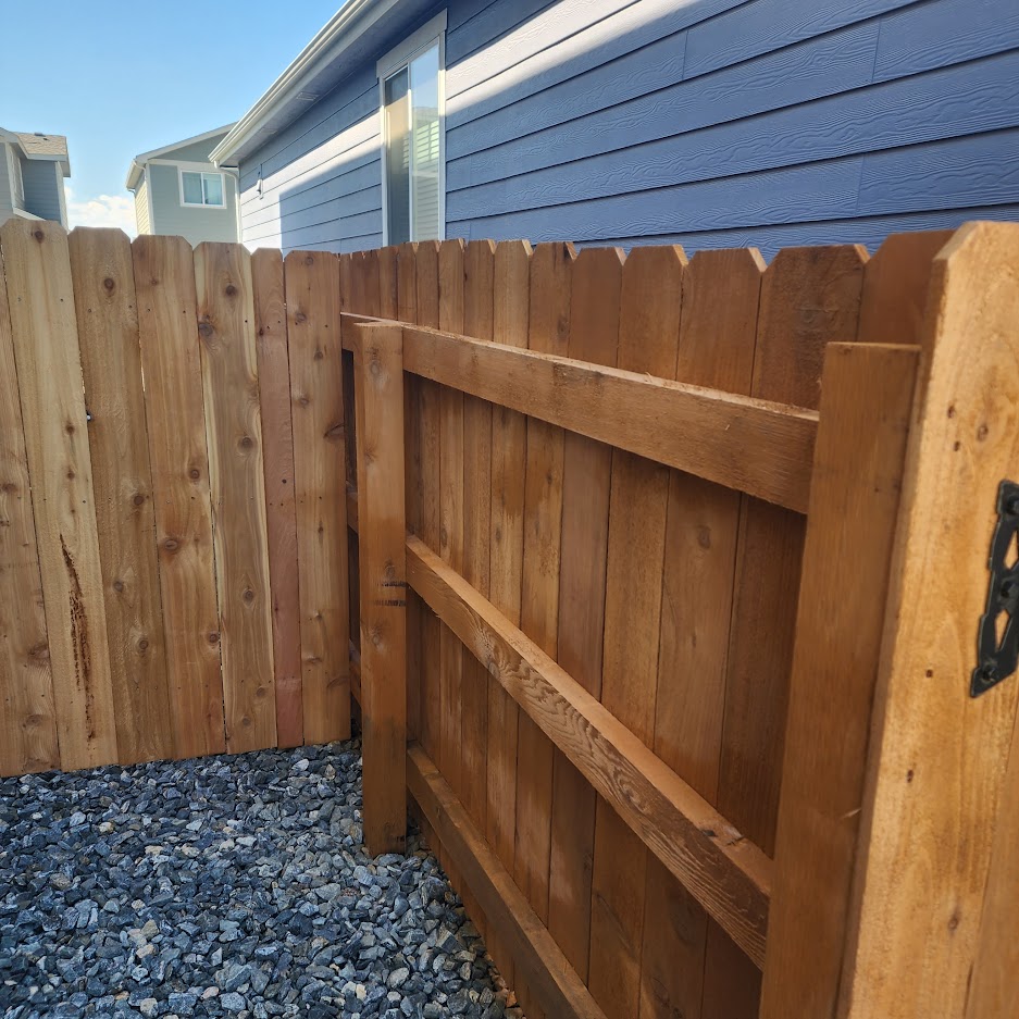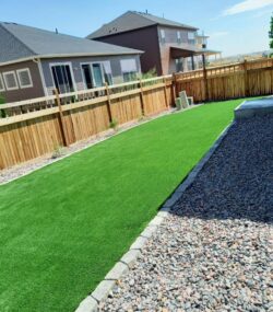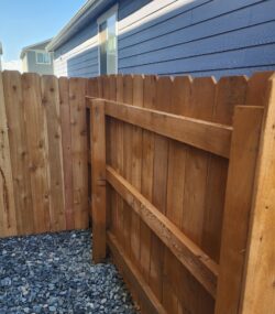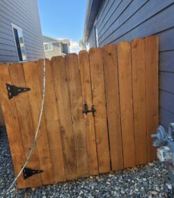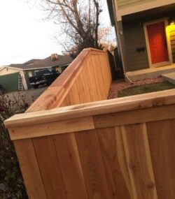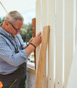 Active senior carpenter at his backyard measuring with a level wooden timber for a new fence
