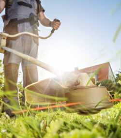 Lawn Moving Aerial Photo. Caucasian Gardener with Gasoline Grass Mower at Work. Landscaping Business. Industrial Theme.