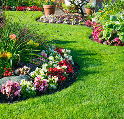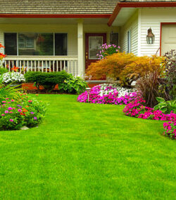 Manicured House and Garden displaying annual and perennial gardens in full bloom.