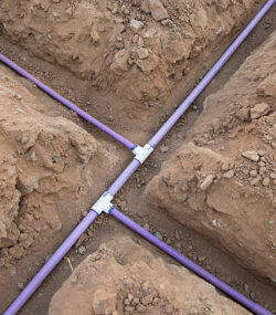 Irrigation pipe in dirt trenches installed for underground sprinkler system.