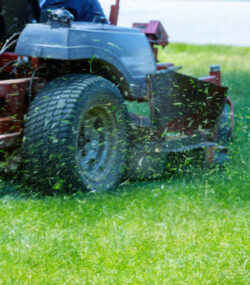Photograph of lawn mower on the green grass. Mower is located on the right side of the photograph with view on grass field.