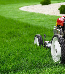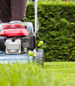 Taking Care of Garden Concept. Garden Plants and Grass Mower in the Background.