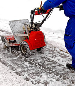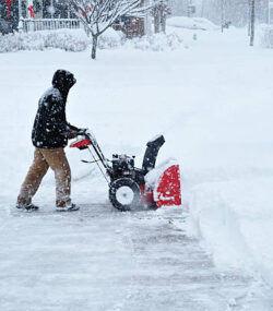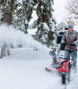 Senior Man Using SnowBlower After a Snowstorm, Quebec, Canada