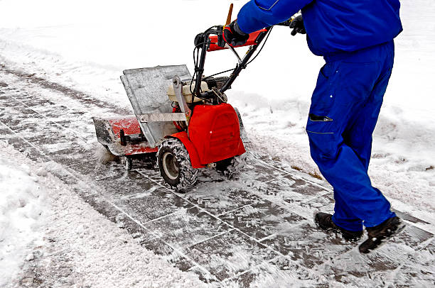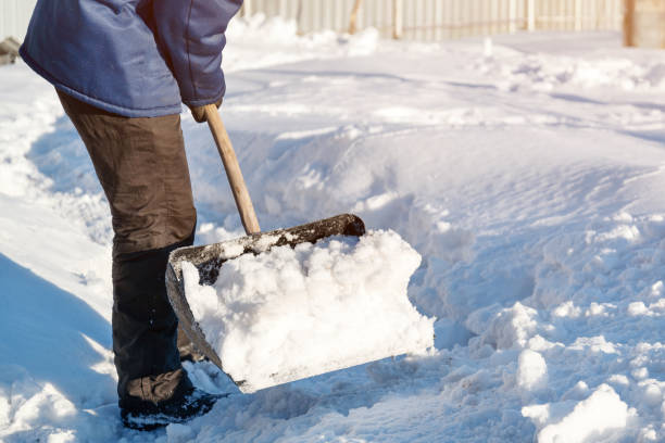 After a snowfall, a person rakes and removes snow in front of his house. Emergency, snowfall