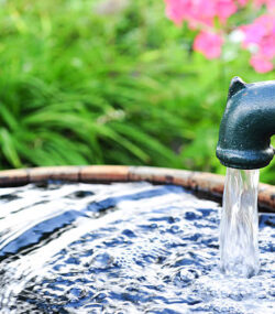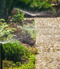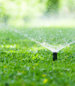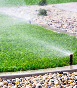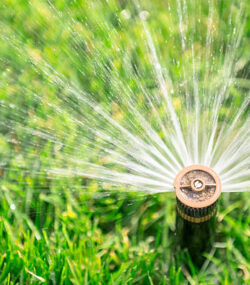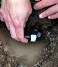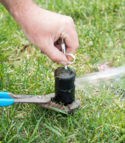 A pop-up sprinkler system head is being adjusted with a key to decrease or increase radius of the spray.