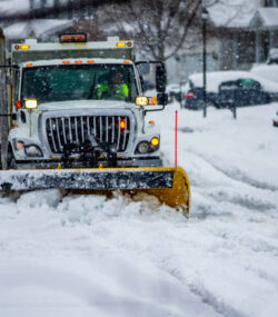 Heavy equipment driver working to push snow to the side of the streets after a blizzard