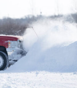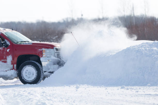 Erskine, USA – March 10, 2019: A Chevrolet 4×4 pick-up truck with an attached blade is plowing deep snow after a Minnesota blizzard.